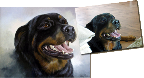 Hieronder een rottweiler geschilderd met olieverf op paneel formaat 50 x 60cm. Met een enkele