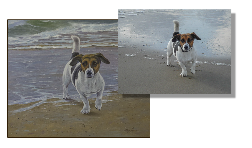 Hieronder Django, een Jack Russell geschilderd op een 50 x 60cm 3d olieverf op doek met brede doorgeschilderde zijkanten. De aangeleverde foto als voorbeeld er naast.