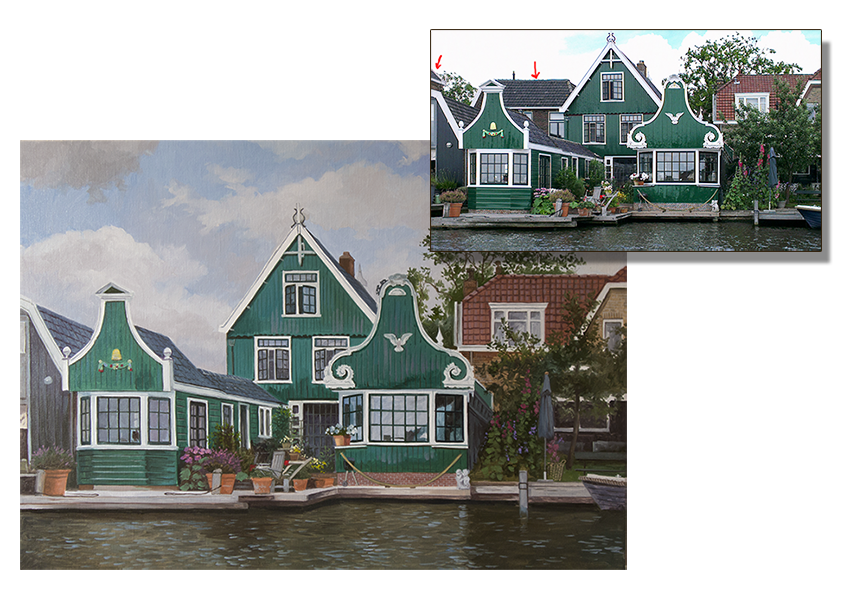 Onderstaand een huis geschilderd in opdracht, waarbij de eigenaar aangaf op de aangeleverde foto wat er niet bij geschilderd mocht worden. Olieverf op linnen 50 x 70cm.